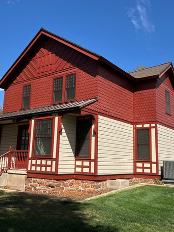 When the vinyl installed in the late 1980s was removed, the extent of what had been lost became clear: the historic flare at the second-floor shingle transition had been cut away, decorative corbels had been covered or removed, and intricate wood trim had been stripped from the front facades and roof gables. Missing decorative elements were recreated from salvaged pieces and historic photographs dating to around 1900, including the distinctive flare at the transition between fish scale shingles and drop siding a subtle but defining feature of the original design. Aluminum windows installed around 1970, largely inoperable by then, were replaced with single-hung metal-clad wood windows replicating the historic profiles. All three porches were restored with new wood columns, balustrades, and arched roof brackets matching historic conditions. Exterior paint schemes were researched from surviving paint layers in original materials.